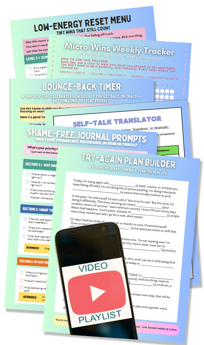Get instant access to 6 powerful, no-fluff tools + a private playlist of real-talk pep talks to help you bounce back fast, ditch the guilt, and start fresh today. Just $7. No subscriptions. No upsells. Yours forever.